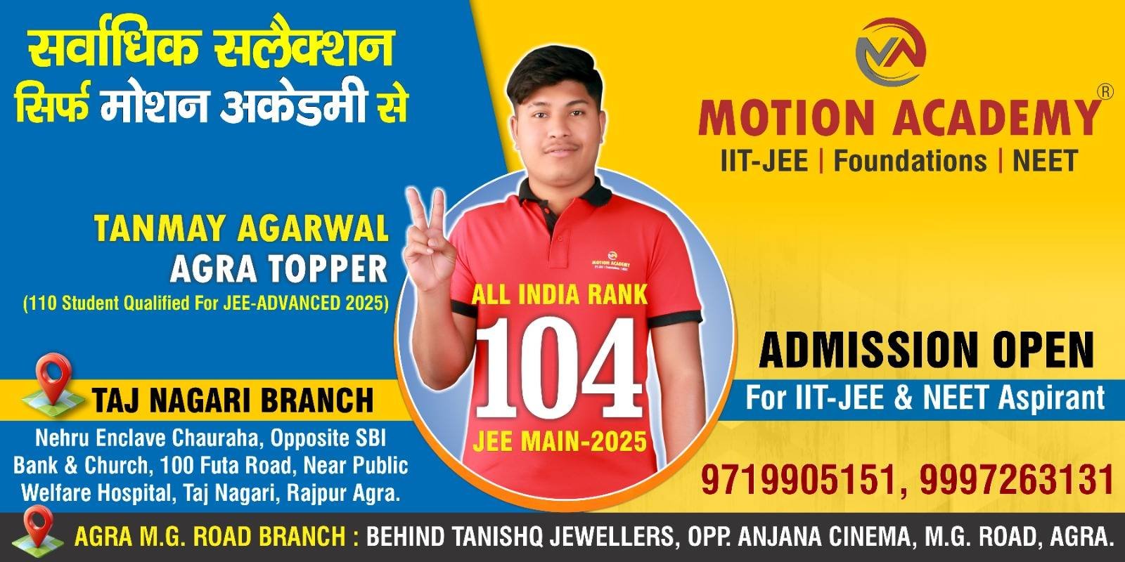मोशन अकेडमी के 110 छात्र-छात्राओं ने पाई सफलता, ऑल इंडिया 104वीं रैंक लाकर बना आगरा टॉपर