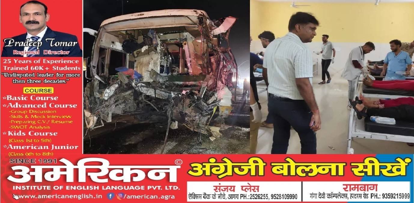 आगरा-लखनऊ एक्सप्रेसवे पर खड़े ट्रक से टकराई बस: दो यात्रियों की मौत, 15 घायल